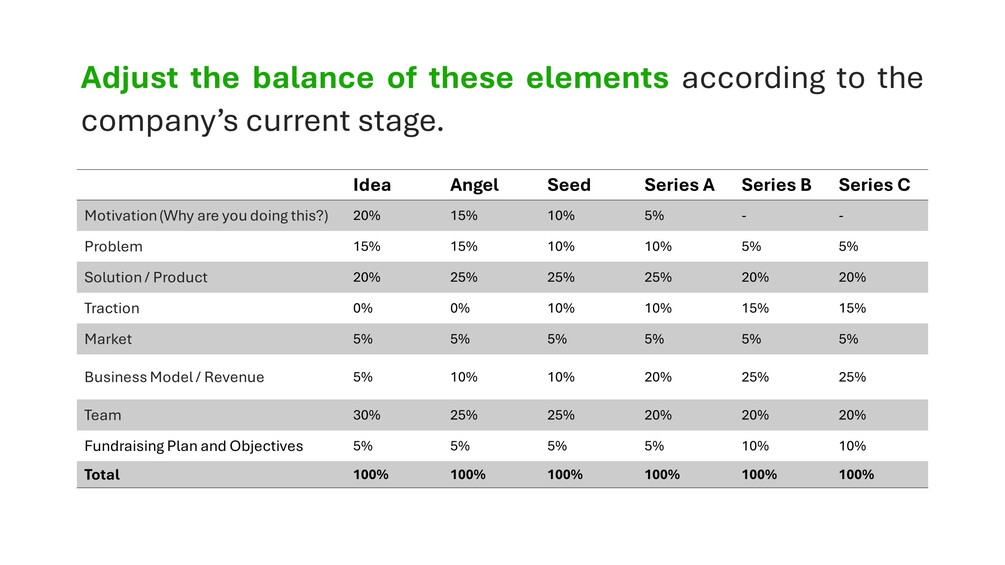 Adjust the balance of the elements below according to the company’s current stage, as explained in the PDF.